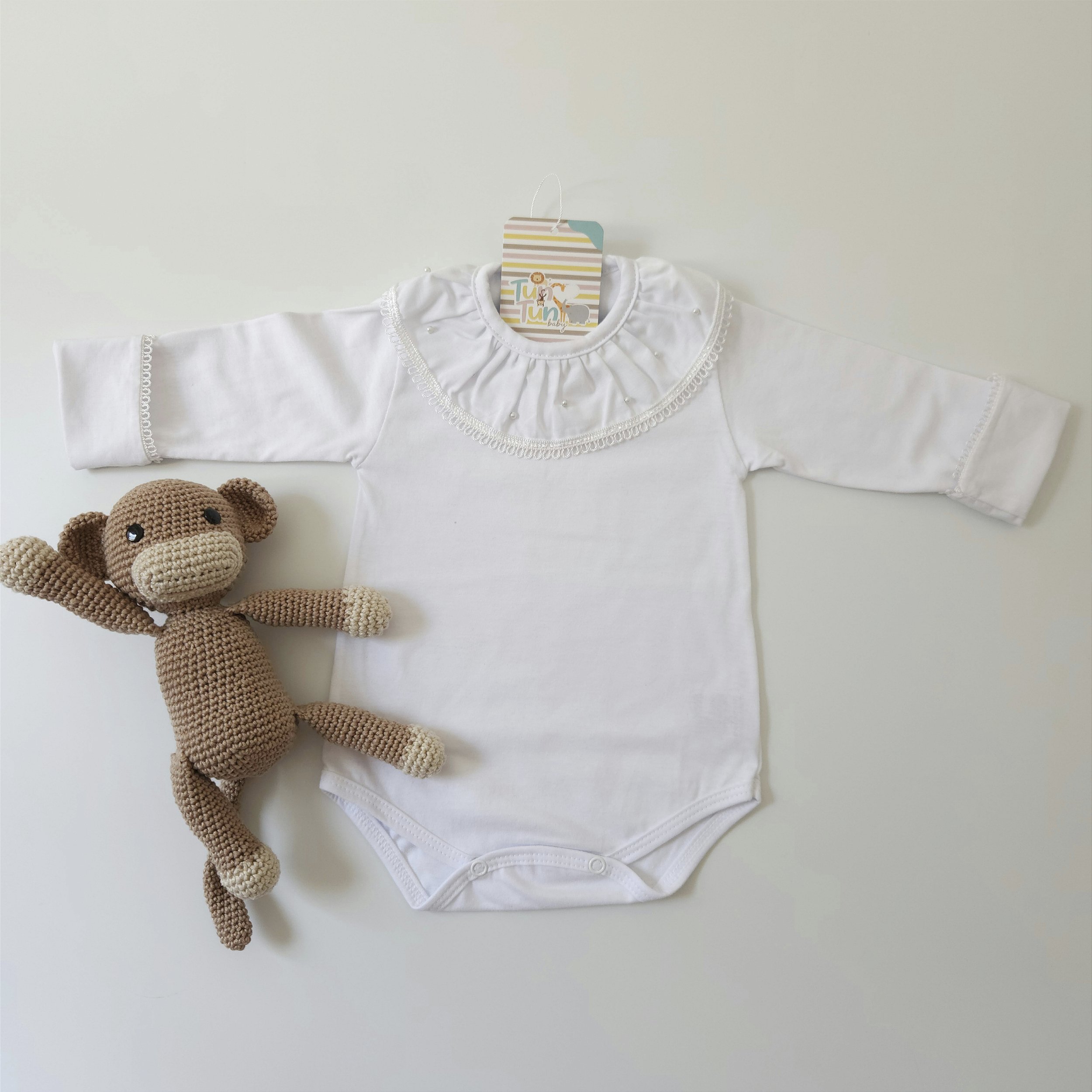 Este body é uma peça indispensável para compor o conjunto de saída maternidade do seu bebê.