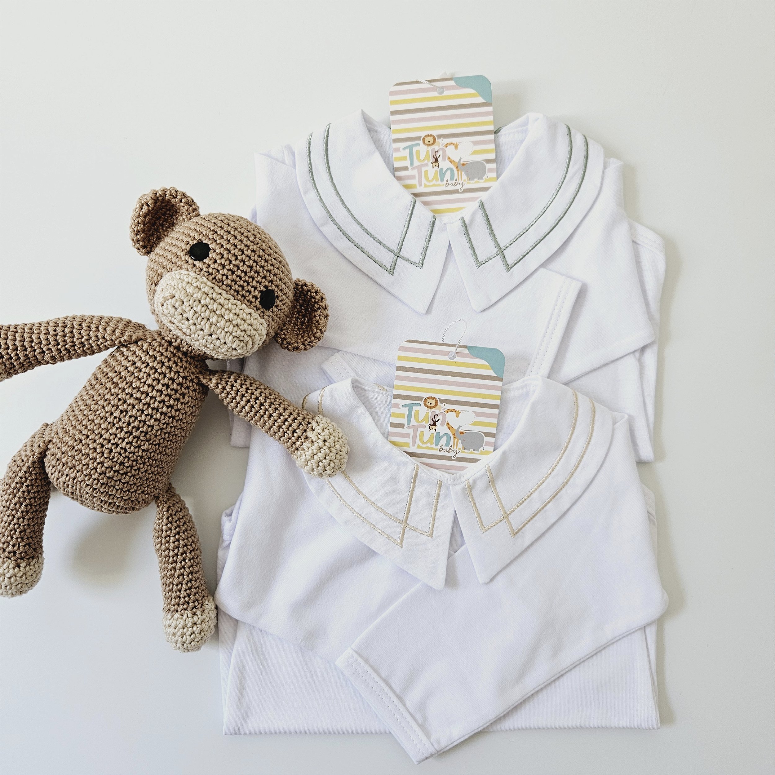 Este body é uma peça indispensável para compor o conjunto de saída maternidade do seu bebê.
