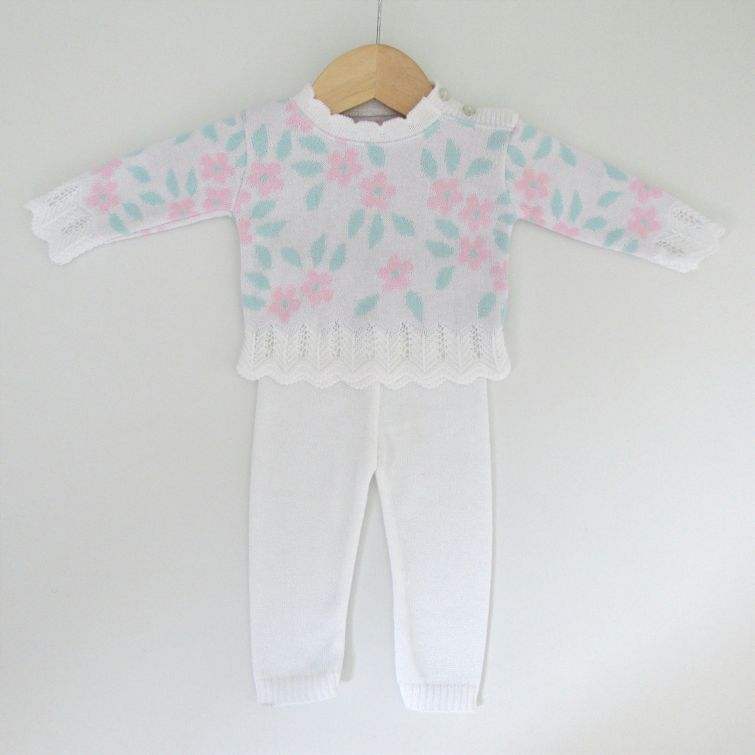 O conjunto é composto por um suéter que possui abotoadura no ombro, com os punhos e beiradas com tramas trabalhadas, e uma calça lisa com elástico na cintura.