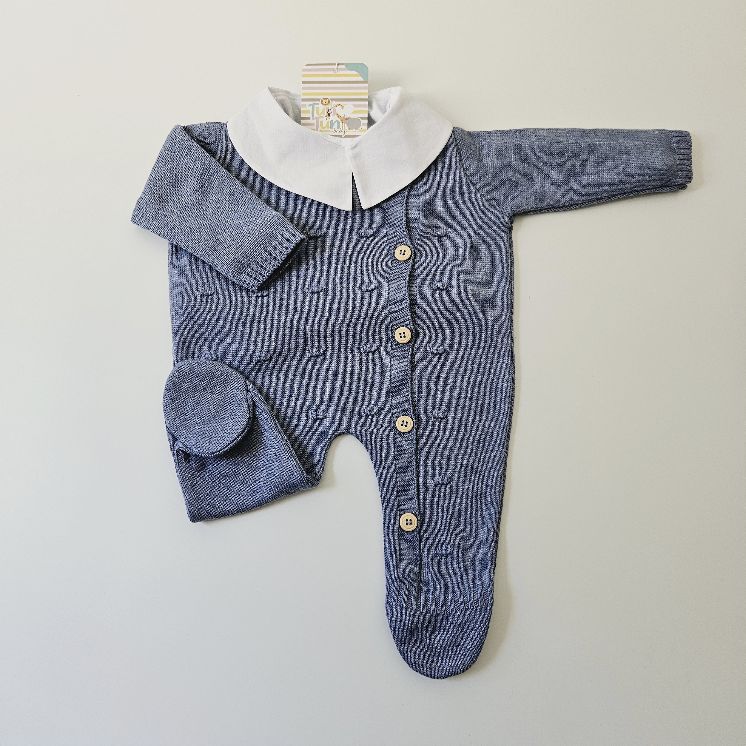Lindo macacão, com detalhe de ponto pipoca e com botões de madeira.