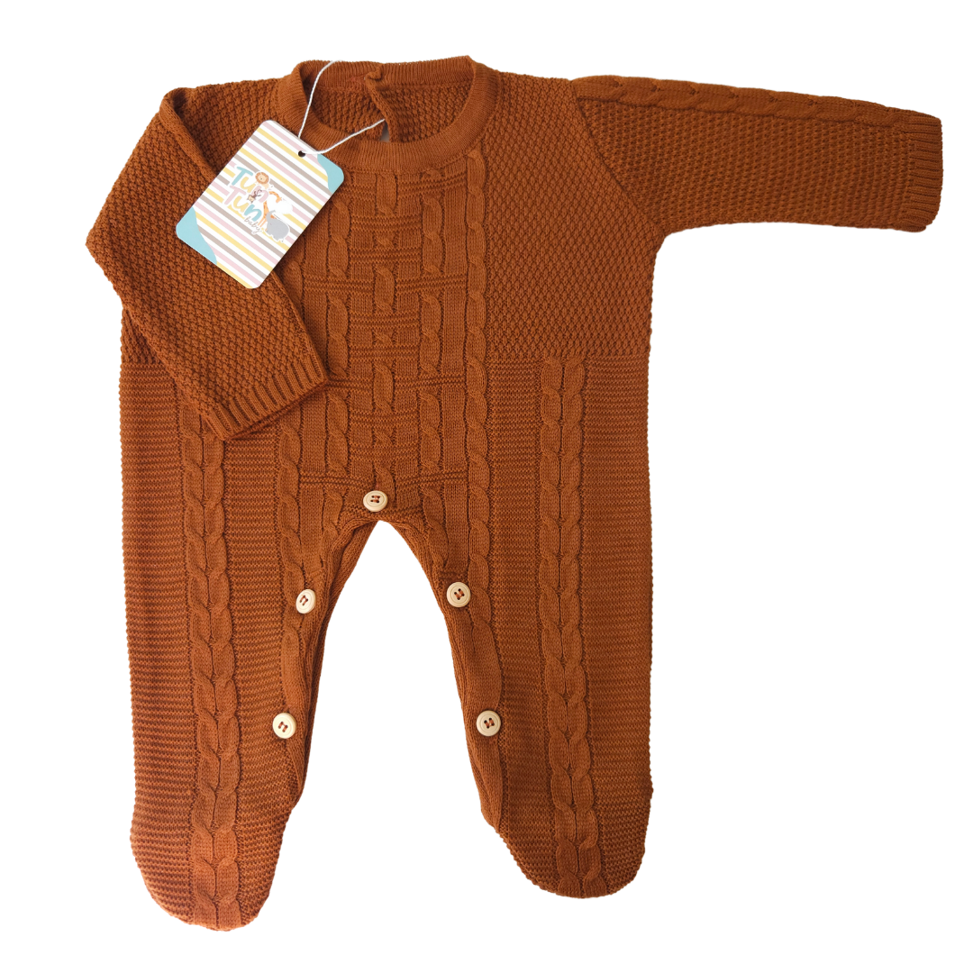 Lindo macacão, com detalhes do ponto em trança e botões de madeira.