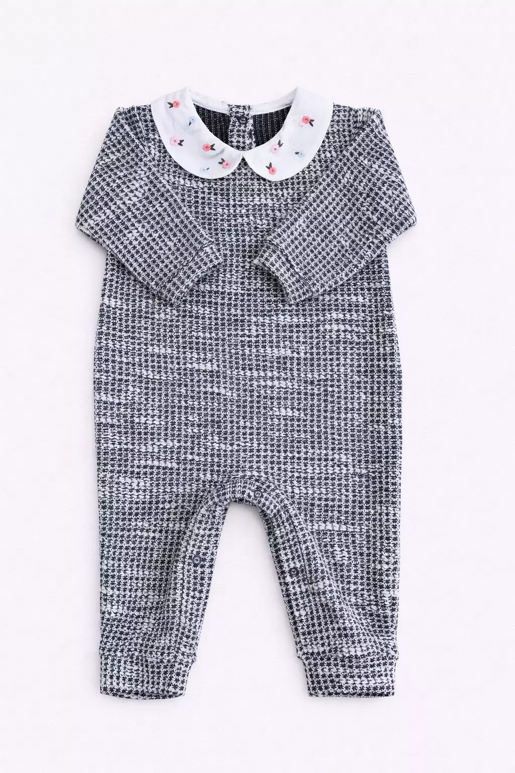 Macacão de moletinho, confortável e macio, com gola bordada que traz um acabamento especial e um charme para a peça.