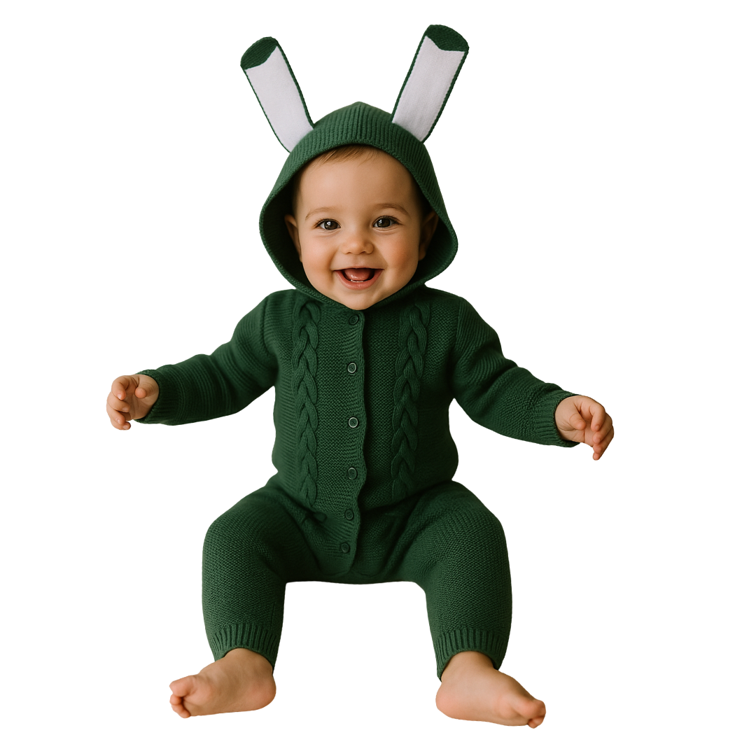 Lindo macacão, com a trama toda trabalhada em trança, com botões de madeira e com capuz de orelhinha.