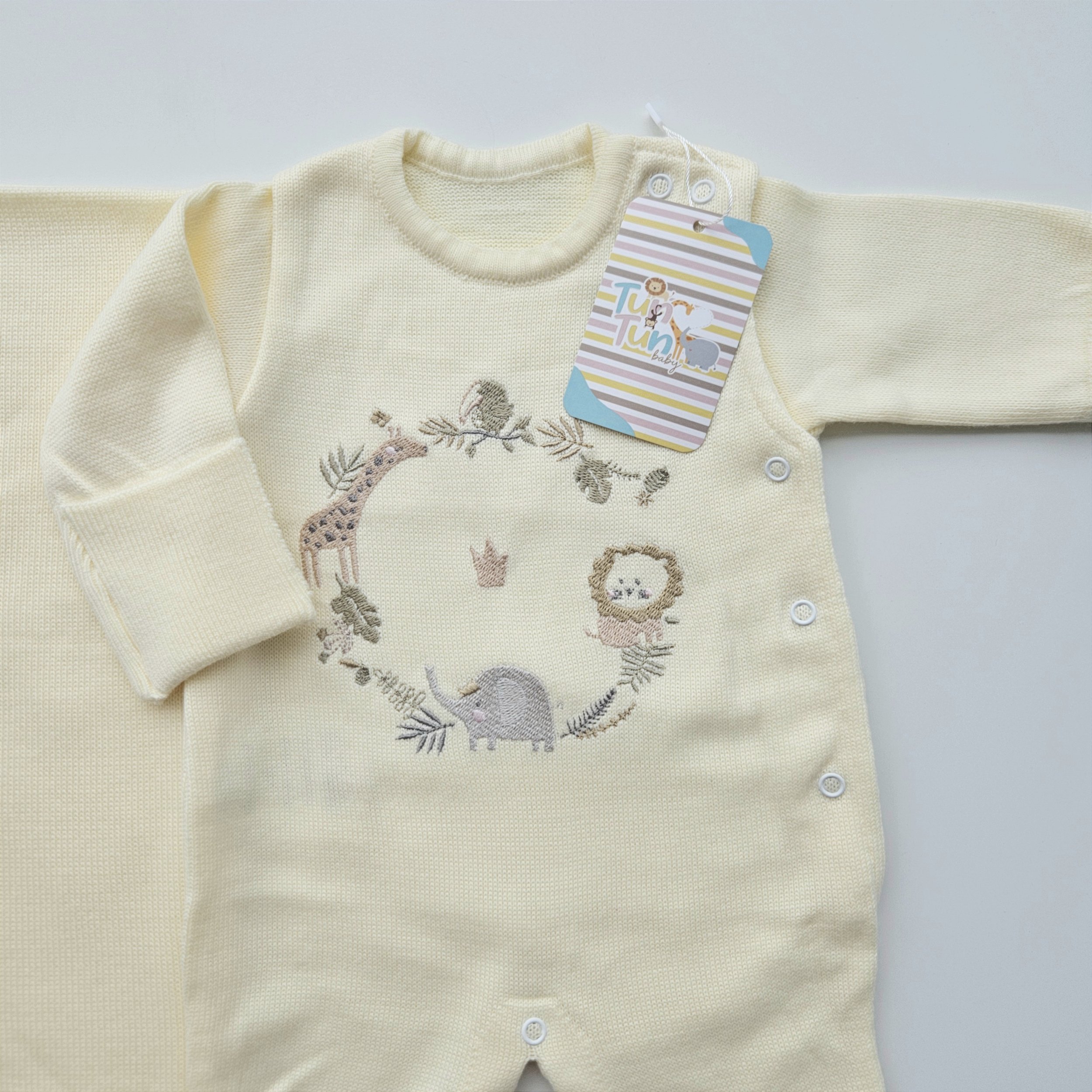 Macacão bordado na parte da frente com bichinhos, o macacão é sem pezinho podendo fechá-lo, possui abertura entre as pernas e na parte de cina na lateral.